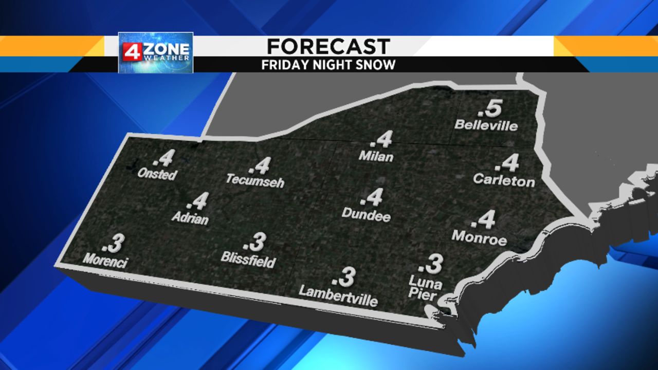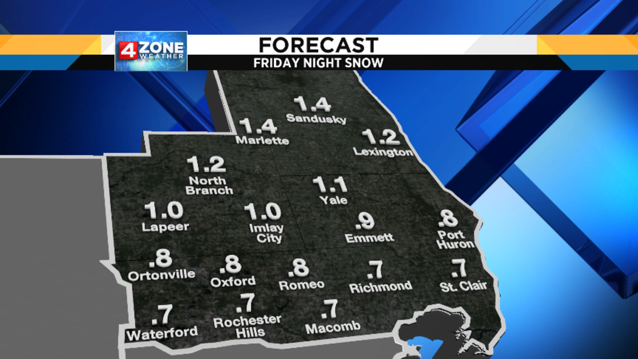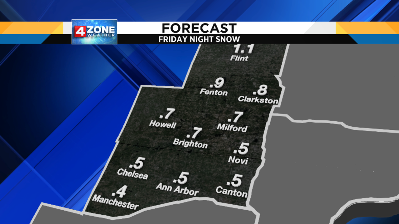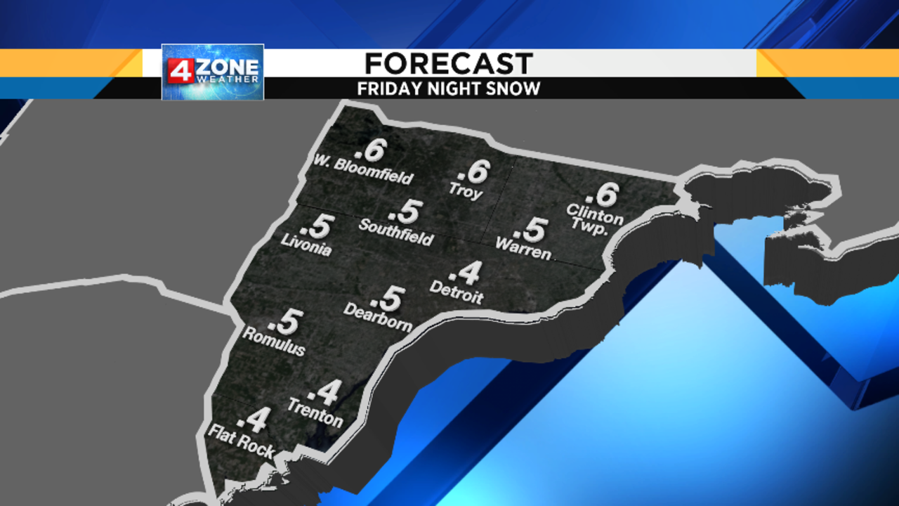 Friday night is really the only somewhat tricky part of the forecast, but the impacts aren’t terribly significant because this particular approaching cold front only has a limited amount of moisture to work with.  Rain and snow (possibly with a small band of freezing rain in between if we’re able to cool down enough before the precip arrives) will develop later Friday evening, and be gone by the time we wake up Saturday morning.  Obviously, the location of the rain/snow line dictates who gets some accumulating snow, and who doesn’t and, right now, it appears that this line should set up somewhere near or a little north of I-696.  Even so, this will be a wet snow and not the fluffy type, so accumulations should remain well under an inch for most of us.  Those of you farther north in our North Zone may see enough snow to get a little above an inch.  To  help you plan, here are some maps showing the timing of things tomorrow evening, as well as my 4ZONE Forecast with the snow amounts I’m expecting right now.  Since temperatures will be a little above freezing, salt will work with maximum efficiency on our roads, so I’m not expecting too much trouble coming home from Festivus parties.