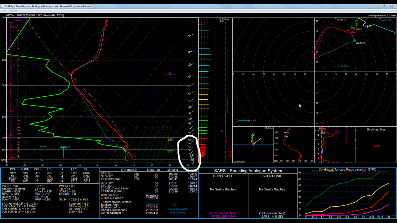 There’s way too much here to even try to explain. However, let me draw your attention to the area I circled…this is projected wind direction and speed as you go aloft from the surface. Notice how, at the bottom (near the surface) the wind is blowing from the south. Then, as you go farther up, the wind is blowing from the southwest. Also note that the wind speed is increasing quickly, too, as you head upward. This sharp change in the wind direction and speed is called wind shear, and what you are seeing (as projected by this one computer model) is very significant wind shear. So, even though we are seeing what appear to be “just” showers on the 6:00 p.m. map above, the tremendous low-level wind shear means that even a routine shower with no lightning could produce a tornado. This is by no means guaranteed – as I mentioned above, there are a number of small-scale details that need to be worked out. But the potential is there, so we need to be prepared.