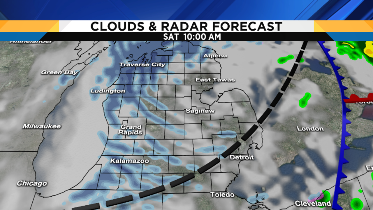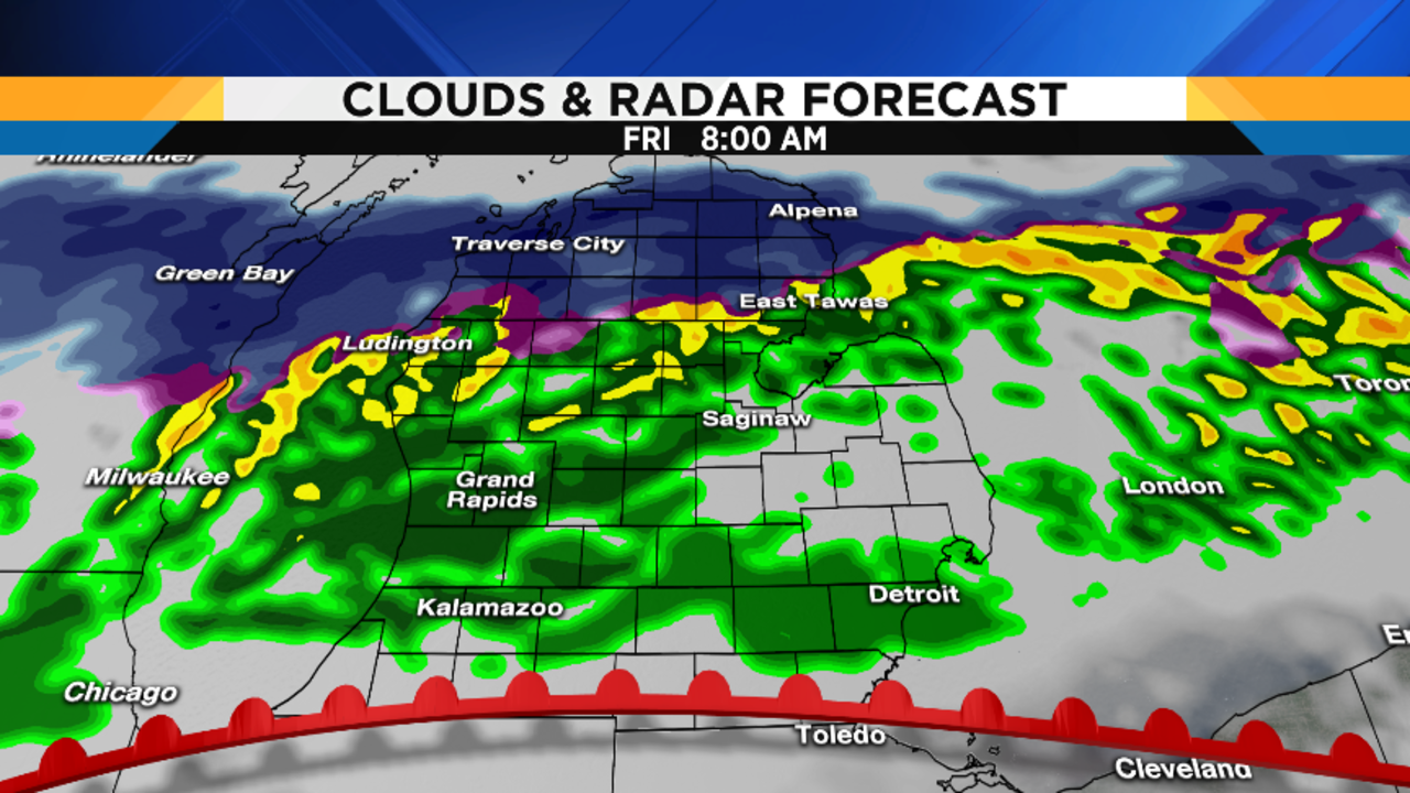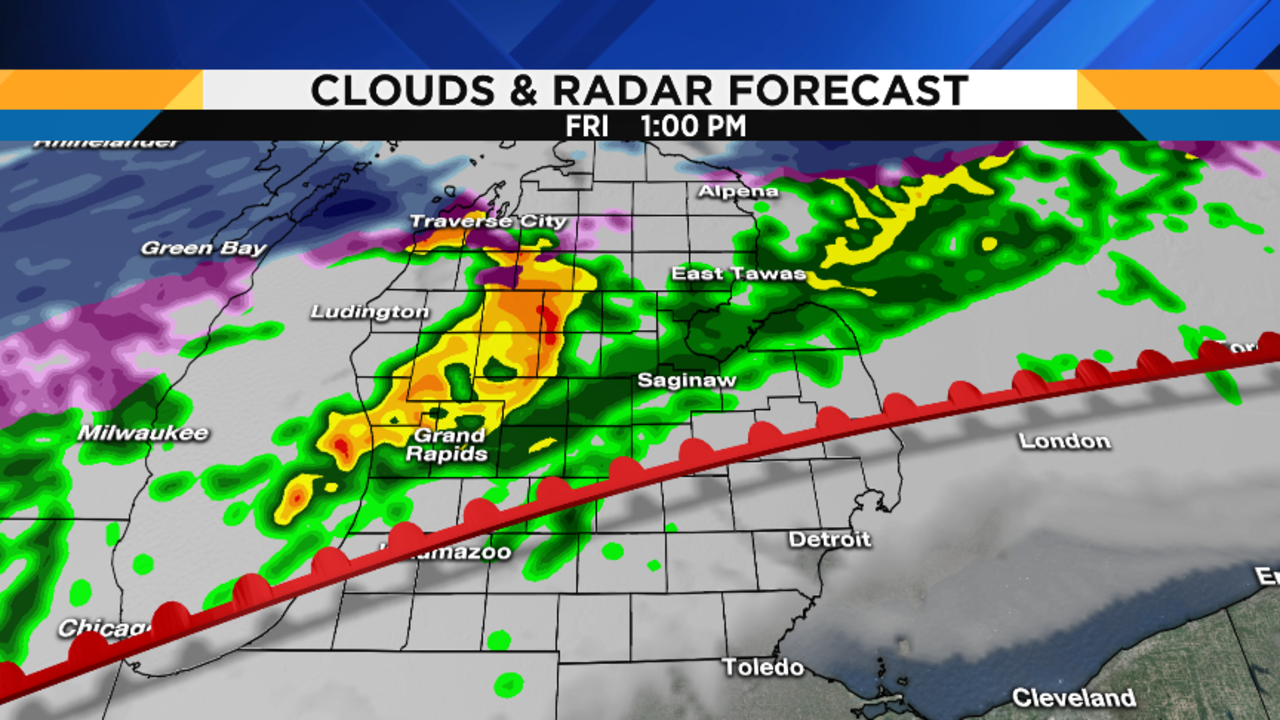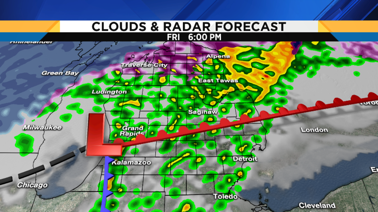 Depending upon the northward speed of the approaching warm front, rain should end from south to north Friday morning (so, those of you in the south will see it end much earlier than those in the north). Some hazy sunshine might even develop. Temperatures will rise quickly as the warm, humid air mass we’ve already seen this week returns to the area, and I expect temperatures south of M-59 to rise into the mid to upper 60s (19 to 20 degrees Celsius). Farther north, your highs may hold in the mid 50s (13 degrees Celsius) in the far north to near 60 degrees (16 degrees Celsius) near I-69.