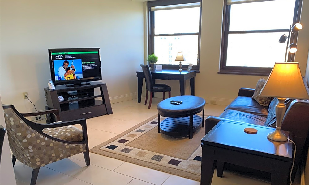 The short-stay unit comes furnished and includes a dishwasher and a balcony. For those with furry friends in tow, this property is pet-friendly. There isn't a leasing fee associated with this rental.