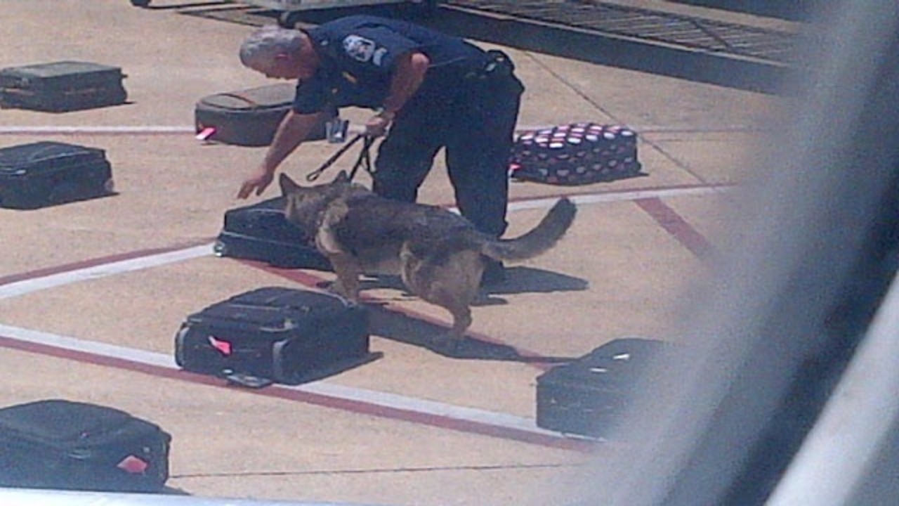 --Dogs sniff luggage from a Detroit-bound plane at Reagan National Airport