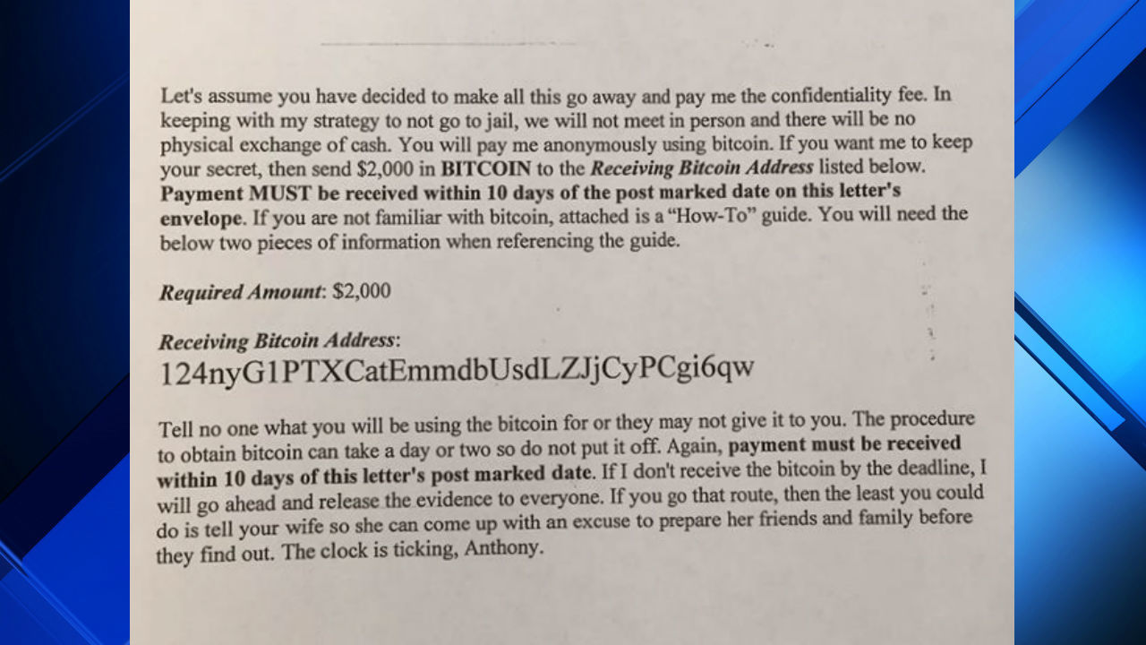 The letter threatened to expose a secret to the homeowner’s wife unless a ransom of $2,000 worth of Bitcoin, or 0.20360BTC.