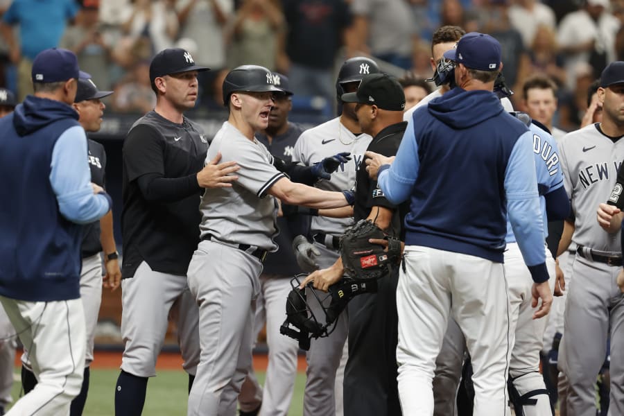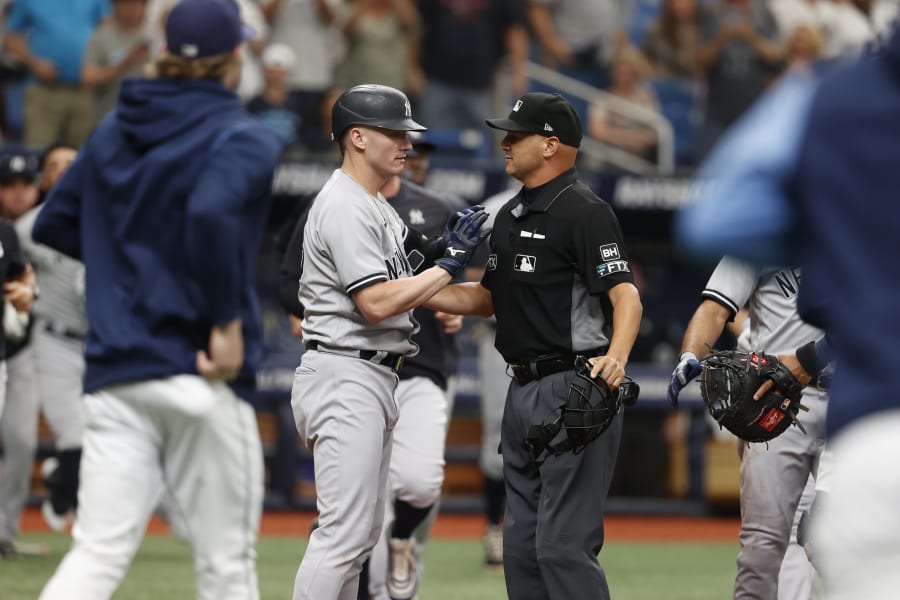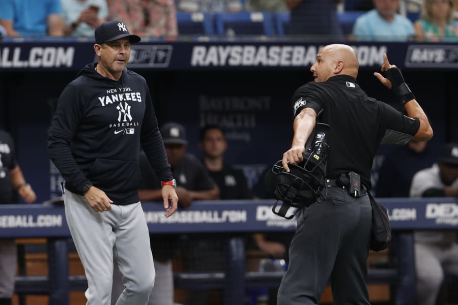 Boone was tossed in the fifth inning by Carapazza for arguing after Tampa Bay’s Taylor Walls reached on catcher’s interference.