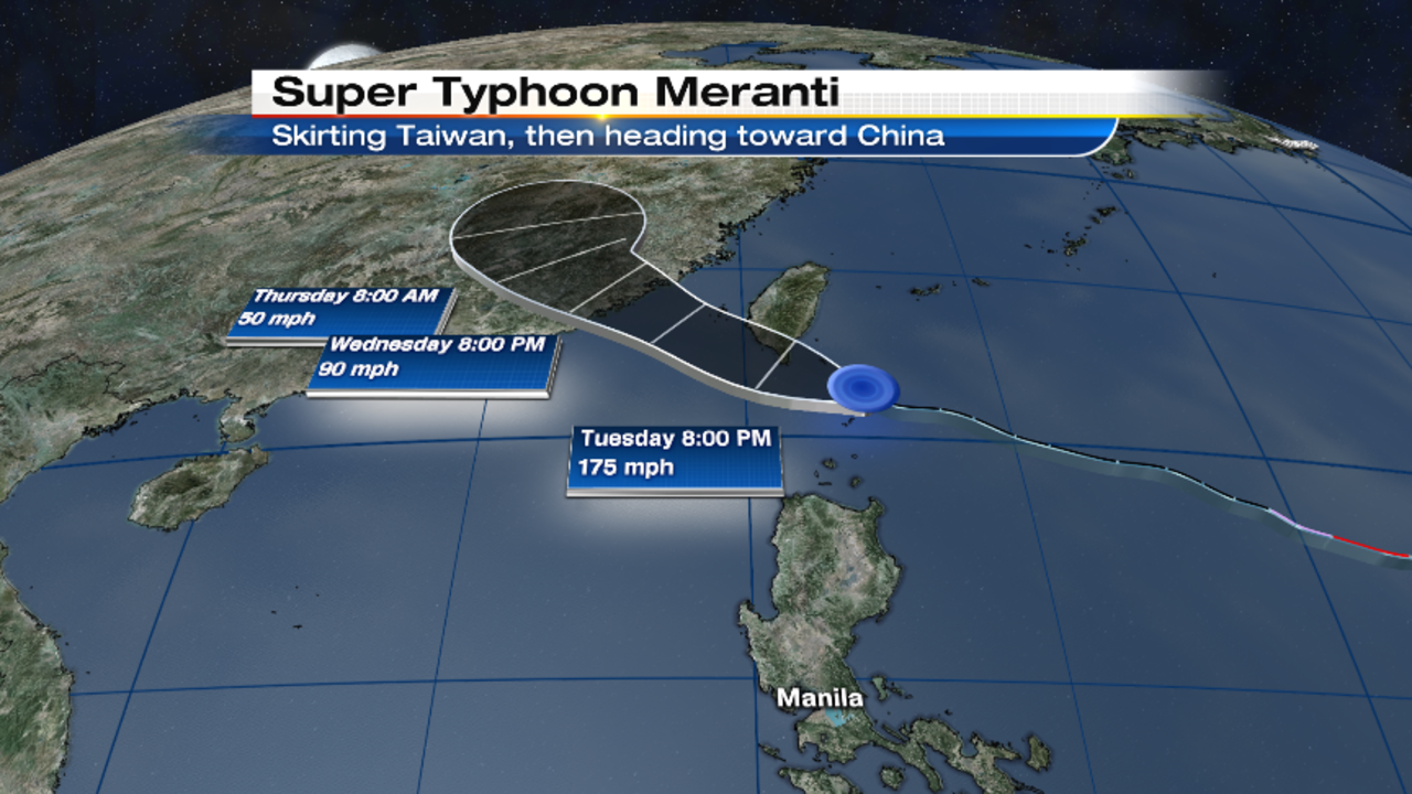 At last report, Super Typhoon Mercanti had 185 mph continuous winds in its eyewall, with gusts approaching 225 mph.